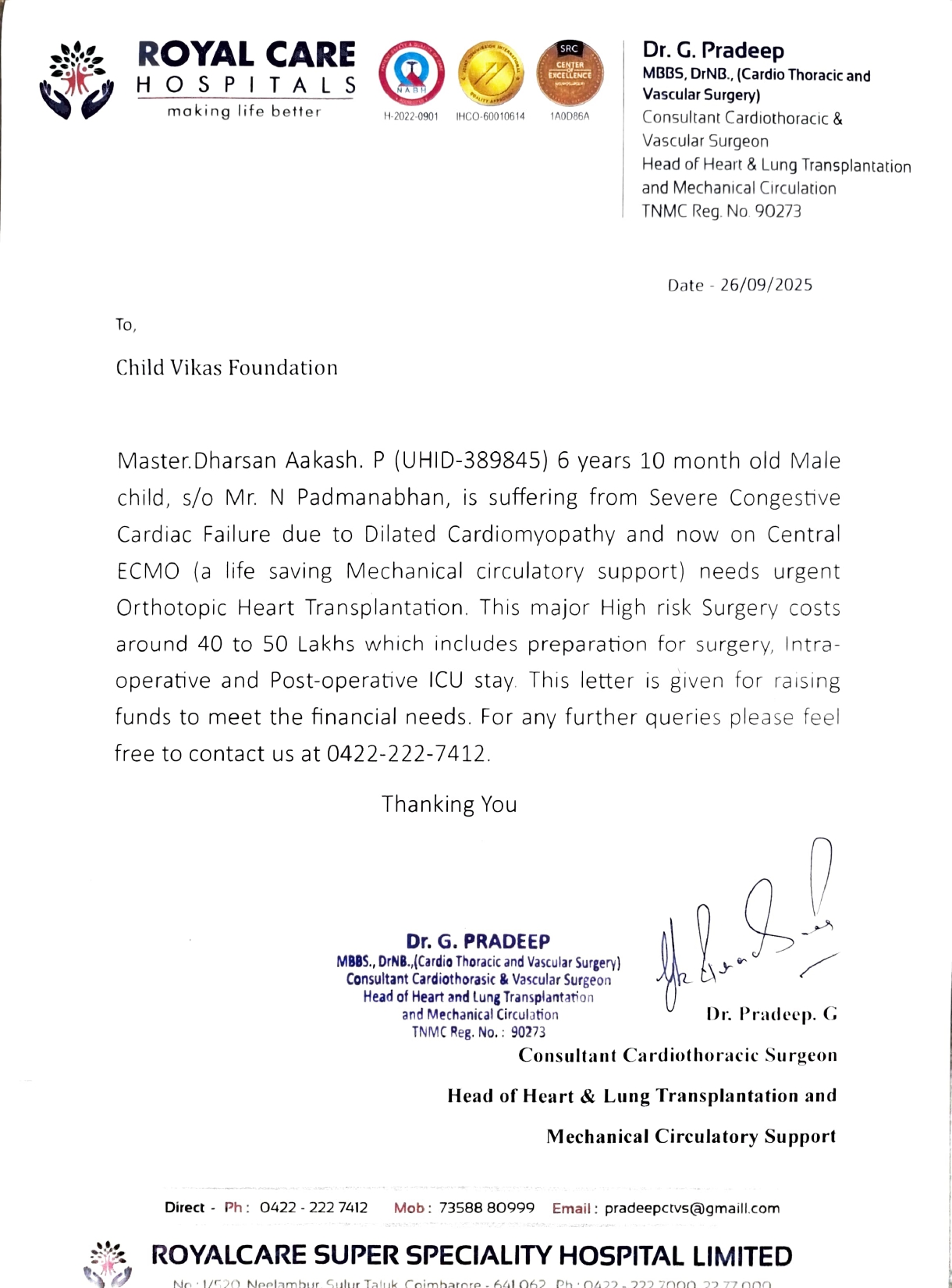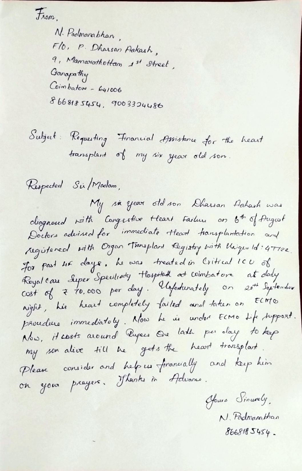 We are writing to you today regarding Master Dharsan Aakash P (UHID-389845), a 6-year and 10-month-old male child of Mr. N Padmanabhan. Dharsan is currently suffering from Severe Congestive Cardiac Failure due to Dilated Cardiomyopathy and is on Central ECMO, a life-saving mechanical circulatory support.