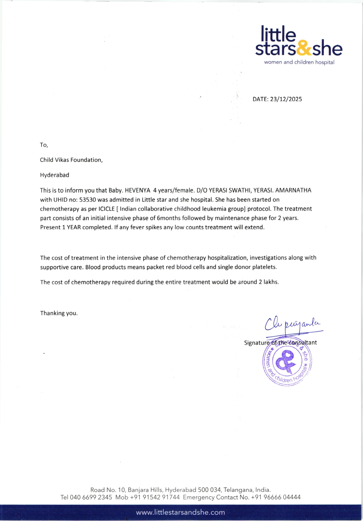 Hevenya was admitted to Little Star and She Hospital and has been undergoing chemotherapy under the ICICLE (Indian Collaborative Childhood Leukaemia Group) protocol. She has successfully completed the first year of her treatment plan.