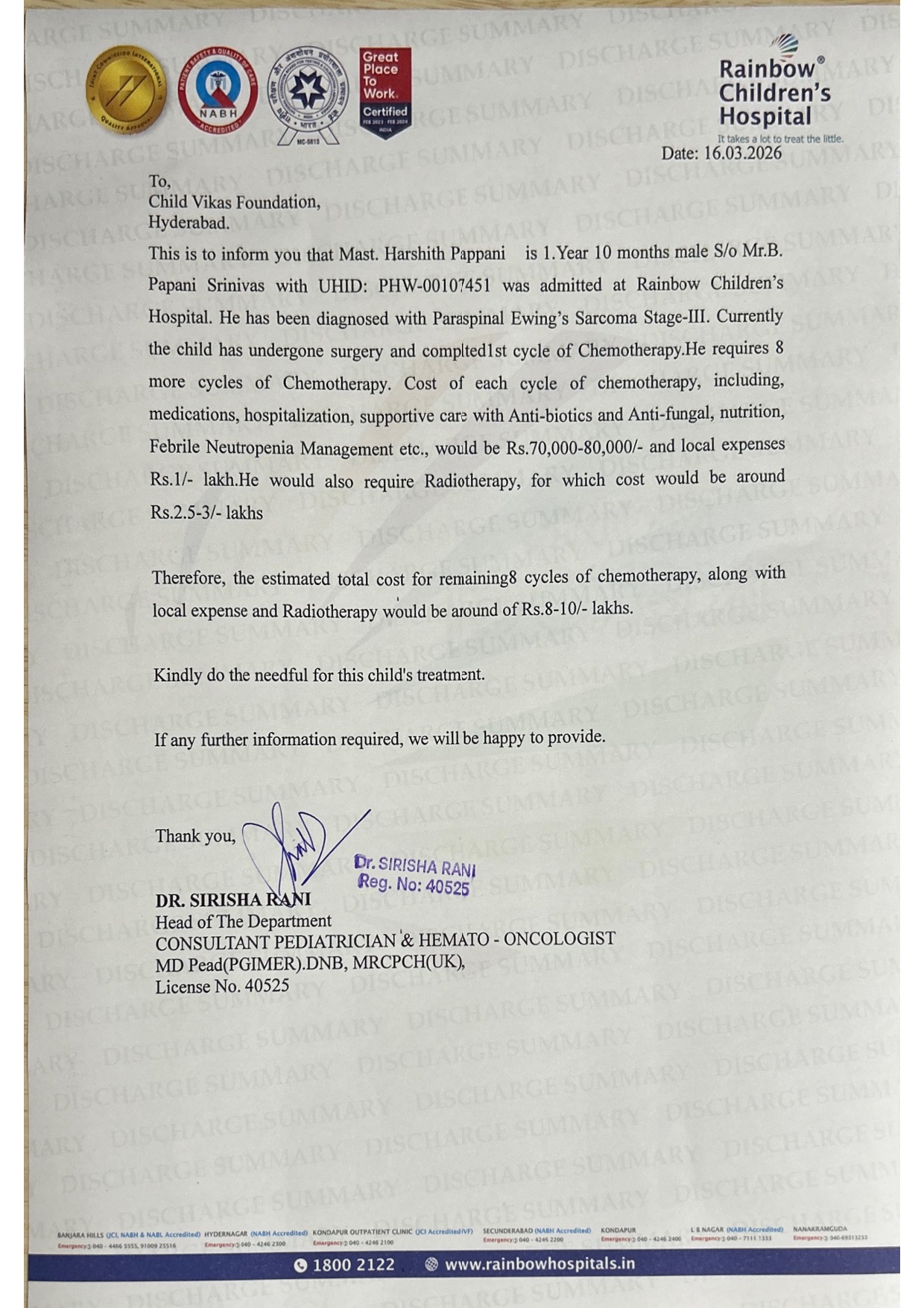 We are writing to seek your urgent support for Master Harshith Pappani, a 22-month-old boy (UHID: PHW-00107451) currently undergoing treatment for Stage III Paraspinal Ewing’s Sarcoma at Rainbow Children’s Hospital.