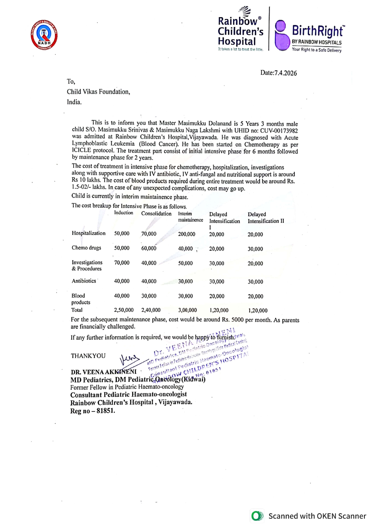 We are reaching out with a humble and urgent request to support the treatment of a young child, Master Masimukku Dolanand (5 years old), who has been diagnosed with Acute Lymphoblastic Leukemia (Blood Cancer).