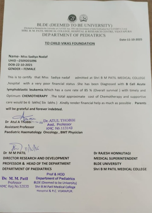 Miss Sadiya Nadaf, a 3-year-old girl (UHID: 2509201096), is bravely fighting B-Cell Acute Lymphoblastic Leukemia (Blood Cancer). She is currently undergoing treatment at Shri B.M. Patil Medical College Hospital.