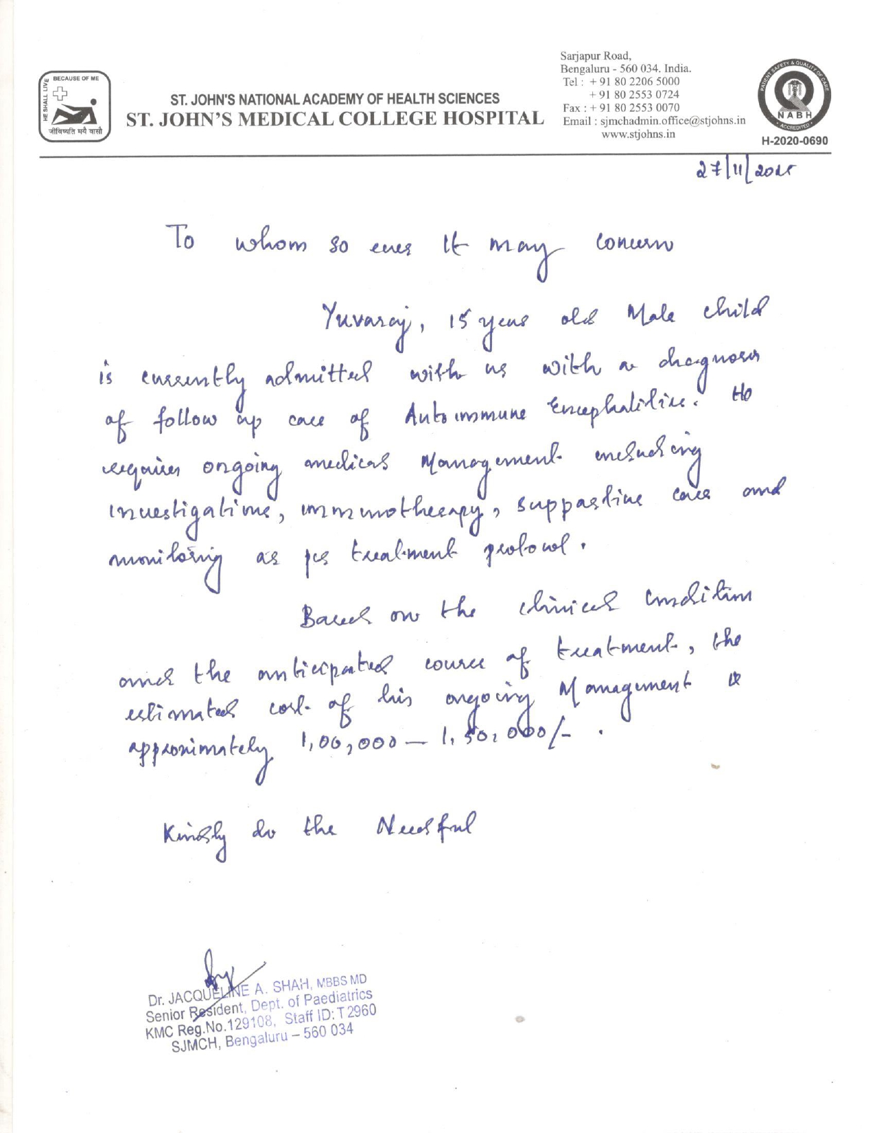 We are reaching out to request your support for D. Yuvaraj (5322847), a 15-year-old boy currently receiving treatment in the Pediatric Medicine Unit – II.